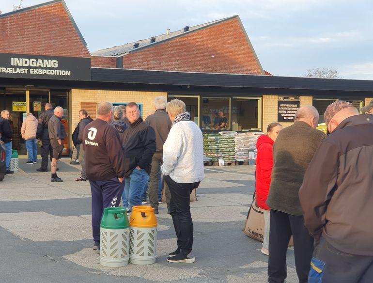 Størst var køen foran tømmerhandlen, hvor kunder stod med tomme gasflasker, der skulle byttes til en god pris.