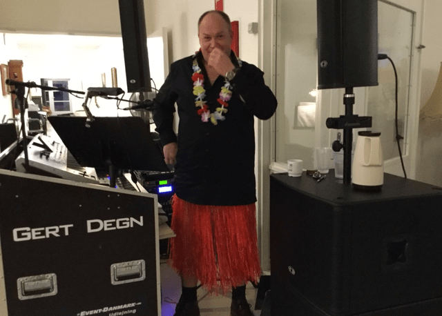 Under spisningen manglede der selvfølgelig heller ikke baggrundsmusik, idet den blev flot leveret af musiker Gert Degn, som i dagens anledning selvfølgelig havde iført sig pinkfarvet bastskørt og blomsterkrans.