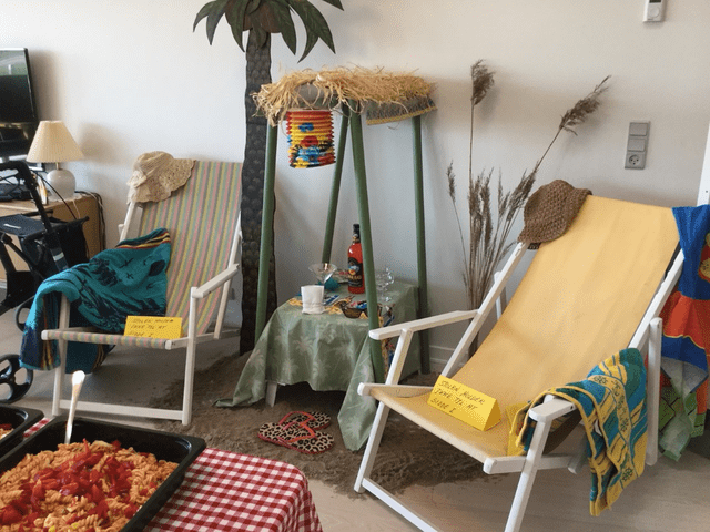 Mange forberedelser blev gjort til Hawaii festen – også udsmykningen. Men brugbar var den til gengæld ikke, for det frarådes at sidde i strandstolene.