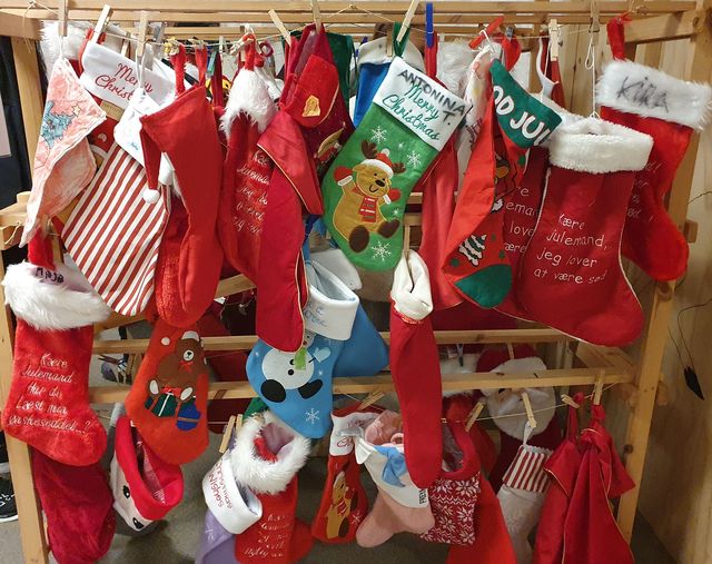 De mange hundrede sokker vil julemanden sørge for have fyldt godter i til den 14. december, hvor de kan afhentes af børnene igen.