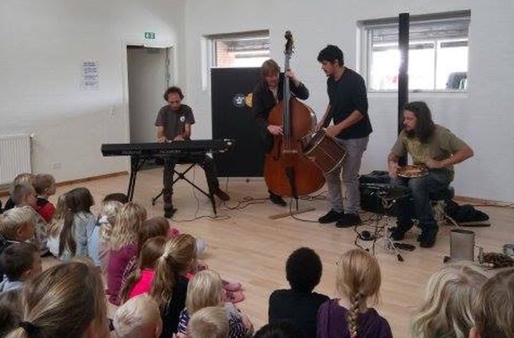 Børnene blev bænket på trappebordene i den nye multisal. De kunne høre et instrument – lyden kom bagfra og ganske langsomt kom én af brasilianerne ind i lokalet fra et tilstødende depot. Pludselig kom franskmanden spillende på sin store kontrabas ind ad en dør et andet sted i lokalet, og de resterende musikere kom også ind ad forskellige døre spillende på deres instrumenter. Det fangede i hvert tilfælde elevernes opmærksomhed.