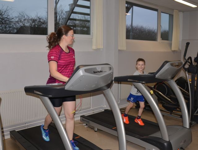Mor og søn, Ane og Oskar Hornbæk Nielsen er sprunget på løbebåndet i motionscentret.