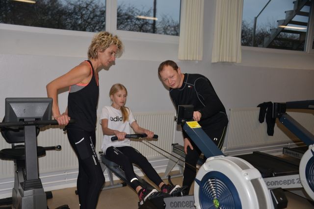 Sussi Nielsen fra Farsø har taget sin datter Alma med, og de begiver sig i gang med styrketræning på ro-maskine og bænkpres.