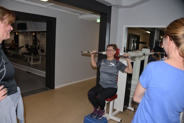 Hver søndag stiller foreningerne med instruktører til de forskellige aktiviteter. Alle instruktører er iført disse grå trøjer. Her er det Betina Hansen der instruerer i motionscentret.