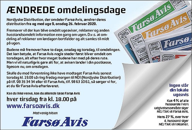 ForsideLokalt Lokalt Farsø Avis – Ændrede omdelingsdage onsdag 26. februar 2020 Del FacebookTwitterWhatsAppLinkedinEmailPrint Læs mere om emnerne ved at klikke på de blå blokke her: ændrede omdelimgsdageAvisFarsøFarsø Avis DET SKER FÅ BESKED PÅ MAIL, NÅR UGENS AVIS ER ONLINE - DU FÅR UGENS HOVEDOVERSKRIFTER OG LINK TIL DEN ELEKTRONISKE AVIS FACEBOOK