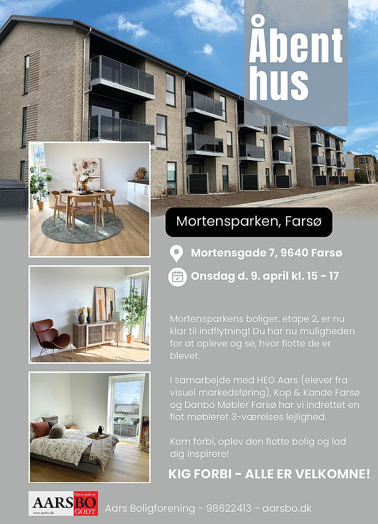 I den forbindelse har Aars Boligforening lavet et samarbejde med HEG, og to Farsø forretninger der forhandler boligudstyr, om at indrette møblere og style en 3 værelses lejlighed til inspiration.