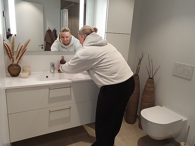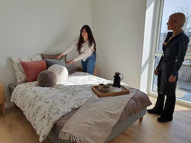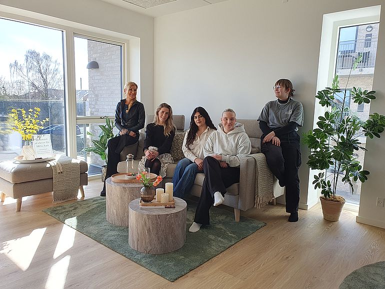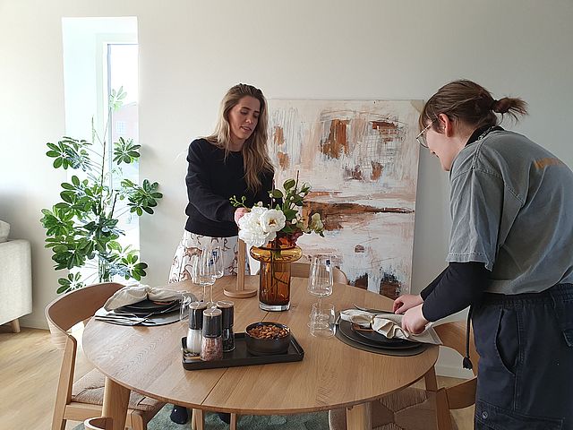 Møblering og styling er dog ikke noget som boligforeningen selv har stået for. De har haft god hjælp fra HEG elever, som i sidste uge som del af deres skoleophold, havde undervisning i modulet visuel markedsføring. Det er anden gang at Aars Boligforening har haft HEG elever til at hjælpe sig.