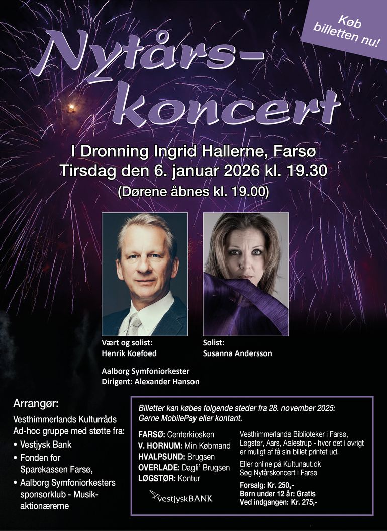 -Vi glæder os til at kunne præsentere skuespiller og logebror Henrik Koefoed og sopranen Susanna Anderson, fortæller formand for Nytårskoncerten i Farsø i regi af Vesthimmerlands Kulturråd, Karen Pedersen.