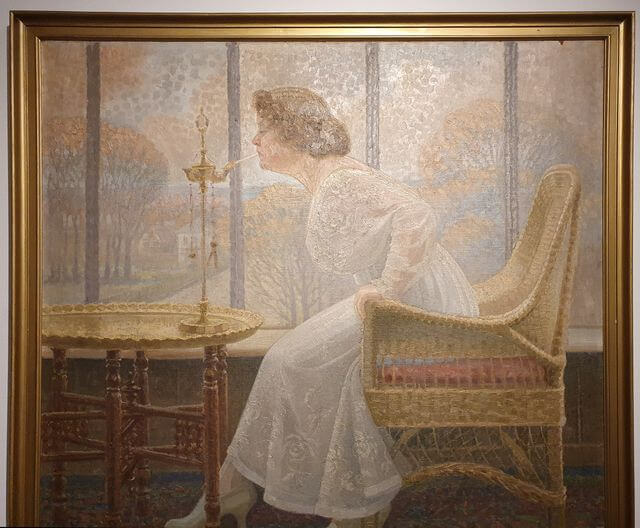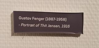 Og det her billede, det er jo malet af Gustav Fenger, Thits 11 år yngre ægtemand i 1914, året før kvinder fik valgret i Danmark. Motivet gentager som sagt billedet, der hænger i de tilstødende lokaler, og jeg er ret sikker på, at han har malet det her først, og siden lavede han den smukke variant deroppe mere detaljeret og en dybere baggrund. Men jeg har altid været meget glad for det her billede hjemme hos mig selv.