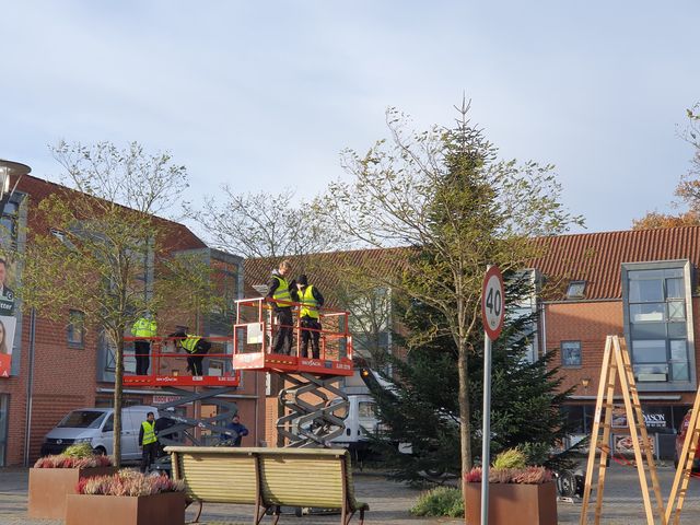 Arbejdet med at sætte kæder på det store juletræ og mindre træer på Store Torv, og opsætningen af de flotte lysparasoller foregik for nemheds skyldt fra lifte og maskiner, der venligst var udlånt af de lokale virksomheder Tyge Tolstrup A/S, Danilift, Versalift og Øgaard El. Det gjaldt også de 18 vejoverhæng med skiftevis stjerner og hjerter, der blev hængt op over hovedgaden