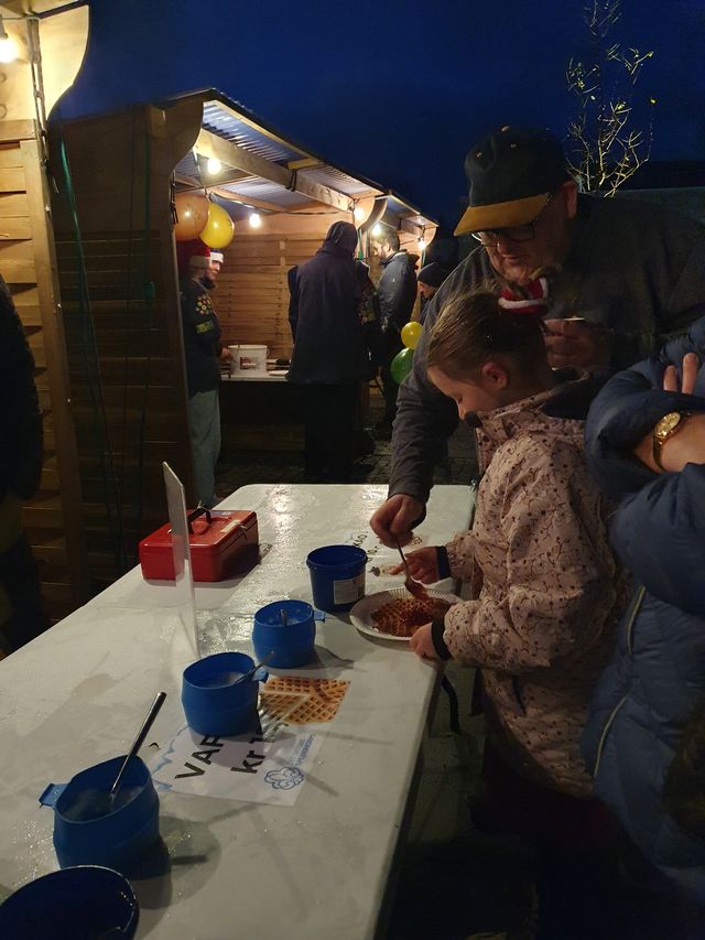 På Store Torv var der opstillet salgsboder med kakao, kaffe, vafler, kandiserede æbler og sågar grillpølser til de ekstra sultne.