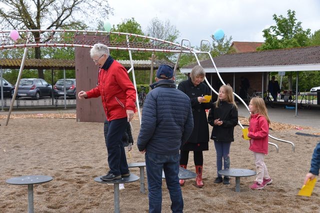 I forbindelse med et opgaveløb som elevrådet på Gedsted Skole havde arrangeret, kunne de voksne ikke lade være med springe med på legen på de nye legeredskaber.