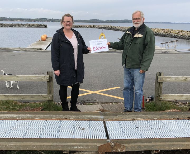 I fredags var kunderådgiver Pia Dam Asutay fra Den Jyske Sparekasse forbi, for at se renoveringen af broen og for at overrække gavebeviset til formand Torben Pind. Den renoverede udsætterbro ses forrest i billedet.