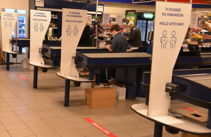 Nye afstandsmærkater er klistret på gulvet ved kasselinjerne i Rema 1000