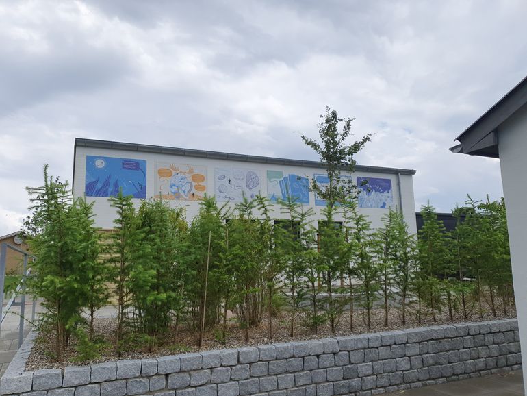 Udsmykningen af museets uderum er inspireret af Johs V. Jensens kultur- og natursyn. De flotte tegninger er udført af tegnestuen Hermann Ditte.