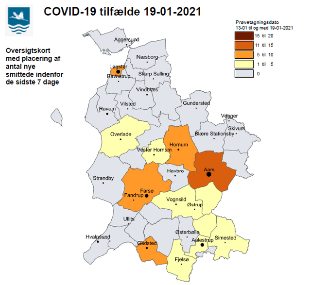 Se hvor de nye tilfælde er på kortet. Tallene er opgjort fra d. 13. januar til d. 19. januar 2021. Alle er talt med – både dem som er testet i Vesthimmerland og dem, som er blevet testet i andre kommuner. Kortet er udarbejdet af Vesthimmerlands Kommune.