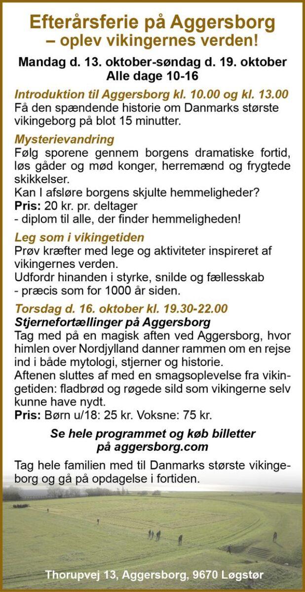 I efterårsferien står Vesthimmerlands Museum og en lang række frivillige bag aktiviteter på Aggersborg, hvor man kan gå på opdagelse i fortidens mysterier, fortællinger og lege.
