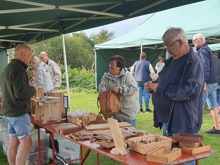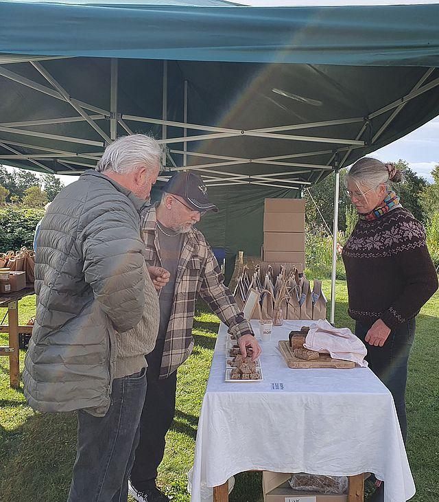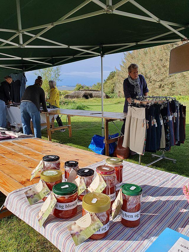 Det betød nye udstillere, men også to færre stande end sidste år. Fremfor alt så artede sensommervejret sig, og markedet kunne afholdes udendørs i Ertebølle Samvirkes nye telte eller i Stenalderhytterne.
