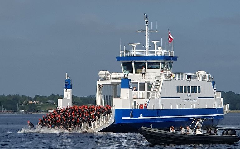Det er i den grad et spektakulært syn når flere hunderede triatleter – fordelt på 2 heat, tager startspringet fra Færgen Marys bovport i Limfjordens vand ud for Hvalpsund.