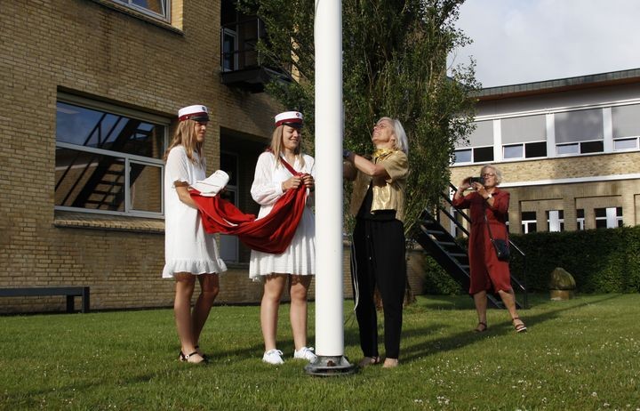 VESTHIMMERLAND: Det var et par glade piger, der mandag morgen fik fornøjelsen af, under kyndig vejledning af rektor Jette Rygaard, at sende dannebrog til tops på gymnasiets flagstang for at markere, at de første studenter fra Vesthimmerlands Gymnasium og HF var sprunget ud.
