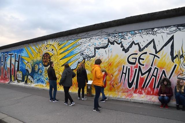 Efter Höhenschönhausen gik turen til Berlinmuren. Den var pænt malet med graffiti på vestsiden. Her brugte eleverne ikke så lang tid, da de hurtigt skulle videre til Checkpoint Charlie. Det er en af de oprindelige grænseovergange mellem Øst- og Vestberlin. Der stod også et par mennesker klædt ud som soldater, så man kunne få taget billeder med dem, for grænseovergangen skulle se autentisk ud.
